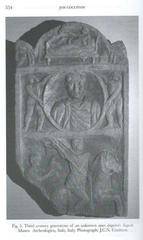 Une invraisemblance du corpus tombe ici fort à propos. Il s’agit d’une stèle conservée au Museo Archeologico de Salò, en Italie qui nous présente un eques singularis inconnu mais qui est fort curieusement gravé, la manière d’en représenter le glaive est anormale. Porté à gauche, il devrait être caché aux yeux du spectateur, toutefois, le sculpteur a pris parti de le faire passer par-dessus l’encolure du cheval, et ainsi, de « forcer » la représentation, ce qui indique une volonté réelle de montrer cet élément.
