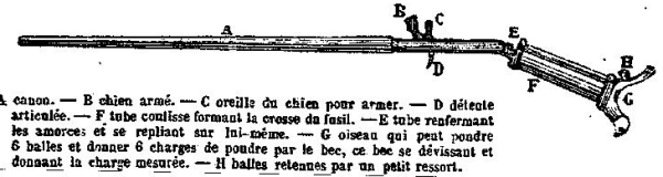 Canne fusil Perreaux, extraite de l’Histoire Scientifique de l’année 1888, voir lien. catégorie D§e)
