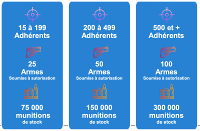 Encore une simplification à saluer. L’ancienne règle était que les clubs pouvaient être autorisés à raison d’une arme pour 15 tireurs avec un maximum de 90 armes. Désormais, il y a trois tranches qui permettent l’acquisition de 25 à 100 armes selon le nombre d’adhérents.