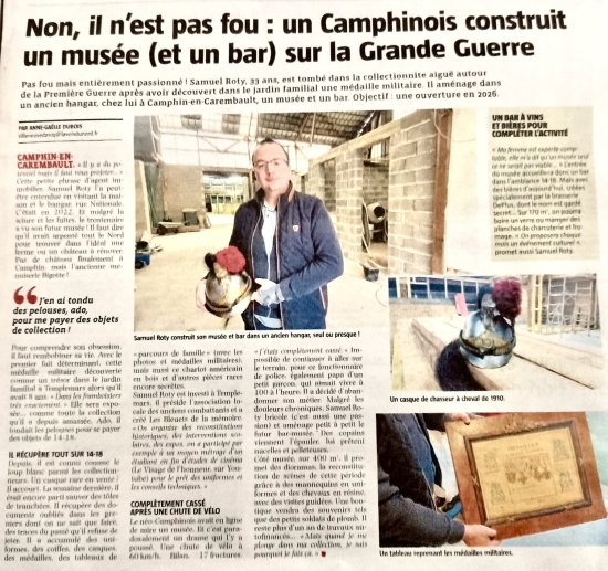 Passionné depuis l’enfance — il a commencé à collectionner à l’âge de 8 ans — Samuel Roty a réuni au fil des années une collection exceptionnelle d’uniformes, d’équipements et de matériel militaire, principalement issus du premier conflit mondial. Un ensemble rare qu’il souhaite désormais rendre accessible au public.