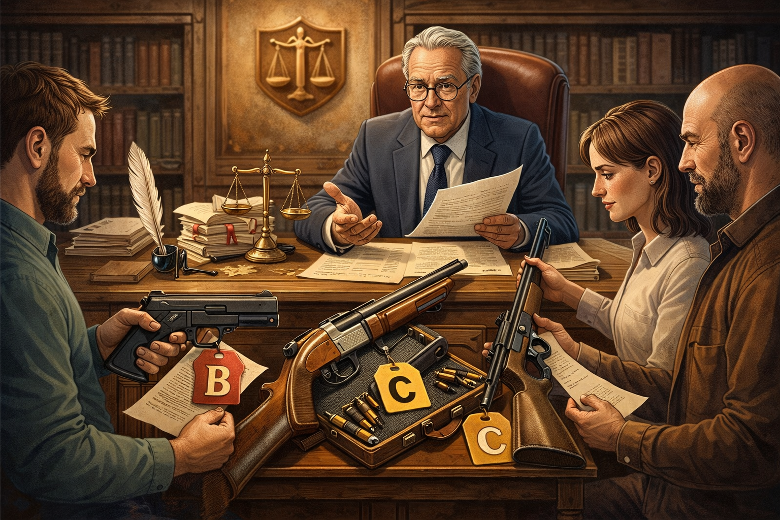 Il n’y a donc pas, à ce stade, de « mise en possession » individuelle, mais une indivision successorale. Durant cette période, le notaire ou les héritiers indivis, doivent prendre toutes les dispositions pour la conservation des armes en sécurité ou encore les déposer chez un armurier.