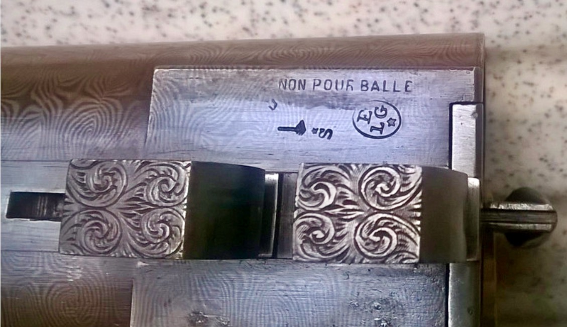 Sur ce fusil signé Lacouture à Lyon, on retrouve deux poinçons qui permettent un classement indiscutable en catégorie D§e). Le marquage « non pour balle » a été utilisé à Liège du 18 avril 1878 au 30 janvier 1897. Le poinçon ELG sur étoile dans un ovale non couronné a été abandonné le 11 juin 1893