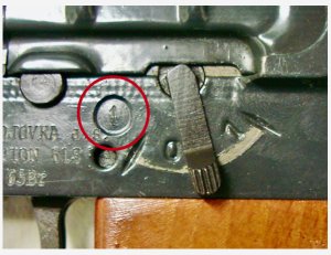 Comme c’est une fabrication standard, a l’origine le sélecteur comportait trois positions, sureté au milieu représenté par le chiffre zéro. Semi-auto à droite représenté par le chiffre un. À gauche se trouvait la position de tir rafale. Lors de la fabrication commerciale, le marquage a été effacé par fraisage et le chiffre un a été frappé. Sur cette arme que le sélecteur soit positionné à droite ou à gauche l’arme ne tire qu’au coup par coup.