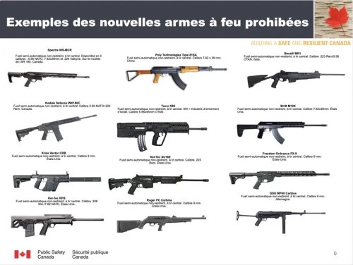 L’interdiction initiale concernait neuf types d’armes spécifiques et leurs variantes, ainsi que les armes de gros calibre (plus de 20 mm) et celles à haute énergie (plus de 10 000 joules). Les « upper » de certains modèles comme les M16, AR-10, AR-15 et M4 étaient aussi visés. Au fil du temps, la liste des armes d’épaule interdites s’est considérablement allongée. Le 5 décembre 2024, 324 modèles supplémentaires ont été ajoutés, suivis par 179 autres le 7 mars 2025. In fine, c’est plus de 2 500 modèles qui sont désormais interdits.