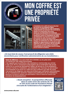 - Coffre fort : Pour éviter toute ambiguïté, nous vous suggérons d’imprimer cette affichette téléchargeable en double exemplaire. Une apposée bien en évidence sur le coffre-fort et une autre que vous donnerez aux forces de l’ordre qui viendraient éventuellement contrôler le coffre. Version n°1 moins consommatrice d’encre, Version n°2 plus moderne.